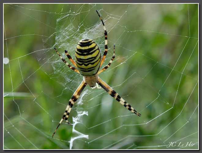 | Août 2006 : Au centre de sa toile géométrique, la grande Argiope-frelon (Argiope bruennichi - Arachnides) attend patiemment. Elle est prête à embobiner telle une momie l'un des nombreux criquets qui finira bien par venir s'y engluer. |