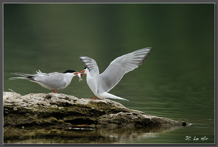 Juin 2011 : Lors de la parade nuptiale de la Sterne Pierregarin (Sterna hirundo), l'offrande alimentaire faite par le mâle (à droite) permet à la femelle d'évaluer son aptitude parentale à bien nourrir la future nichée.