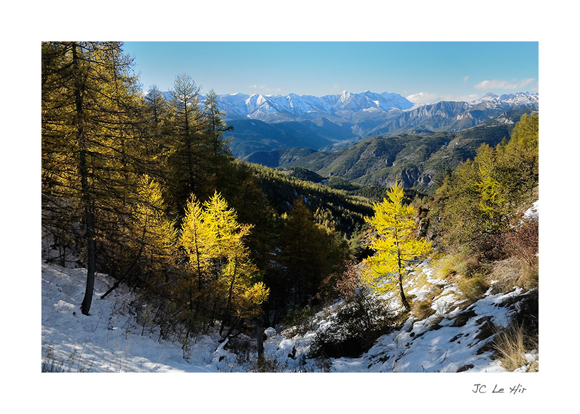 Novembre 2012 : Le Mercantour enneigé à travers un écrin de Mélèzes parés de leur teinte dorée de l'automne.
