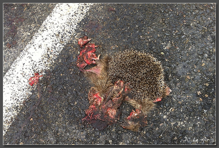 Mars 2013 : Il n'aurait pas dû franchir la ligne blanche ! La nuit a été fatale pour ce Hérisson d'Europe (Erinaceus europaeus) qui, pensant le printemps arrivé, avait quitté sa cachette hivernale.