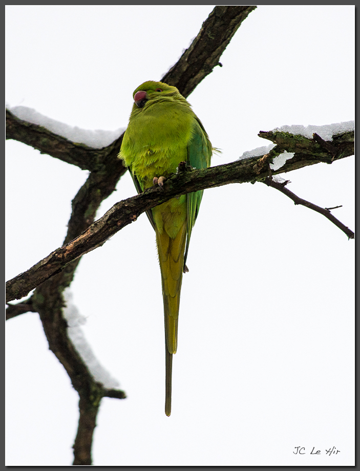 Janvier 2019 : Ambiance tropicale et polaire tout à la fois avec cette Perruche à collier (Psittacula krameri) un jour de neige.