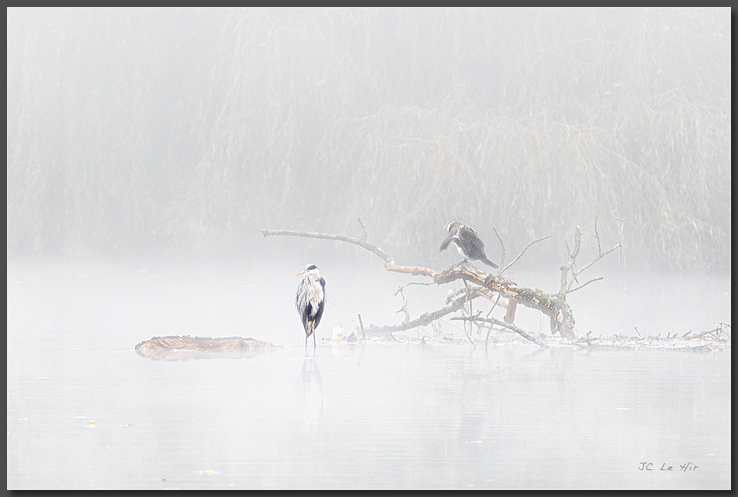Novembre 2021 : Dérivant sur la Marne nappée de brouillard, ce tronc permet à un Héron cendré (Ardea cinerea) et un jeune Cormoran (Phalacrocorax carbo) de se poser un moment.