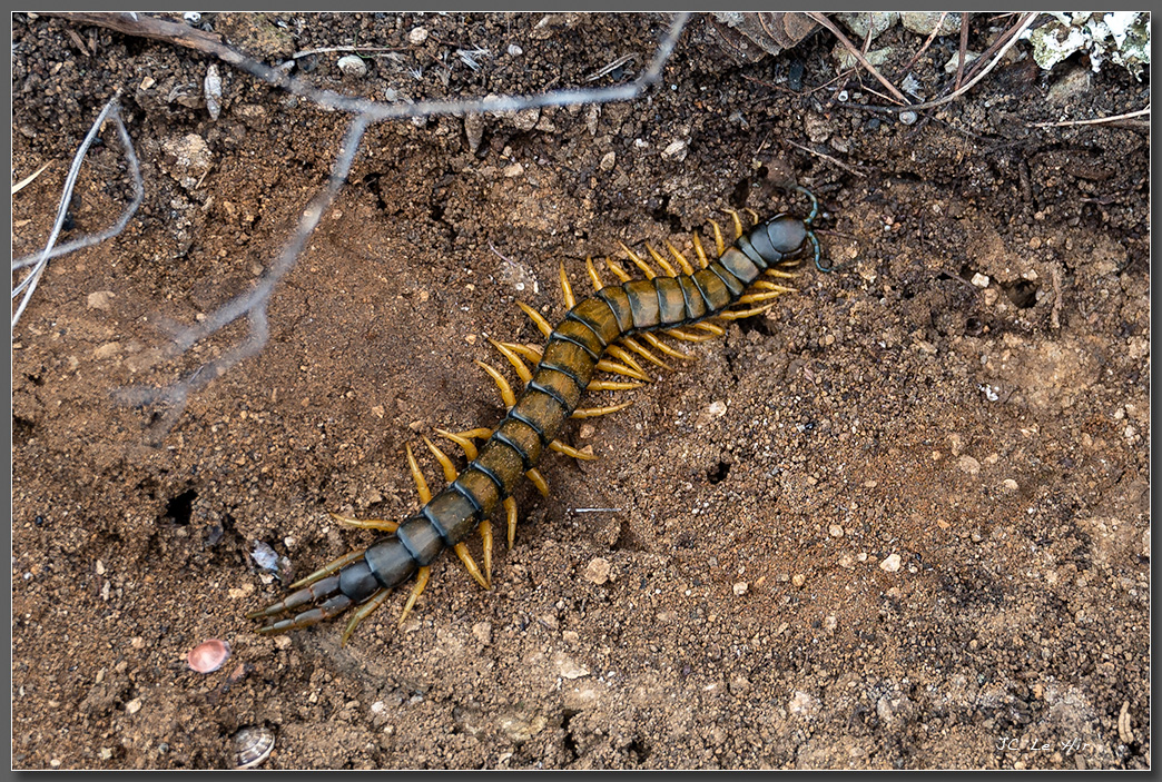 Juin 2021 : Tapie sous une pierre, la grande (plus de 10 cm de long) et méridionale Scolopendre ceinturée (Scolopendra cingulata) attend la nuit pour partir chasser Blattes, Araignées et Escargots. Gare à ne pas se faire saisir par ses deux forcipules venimeuses !