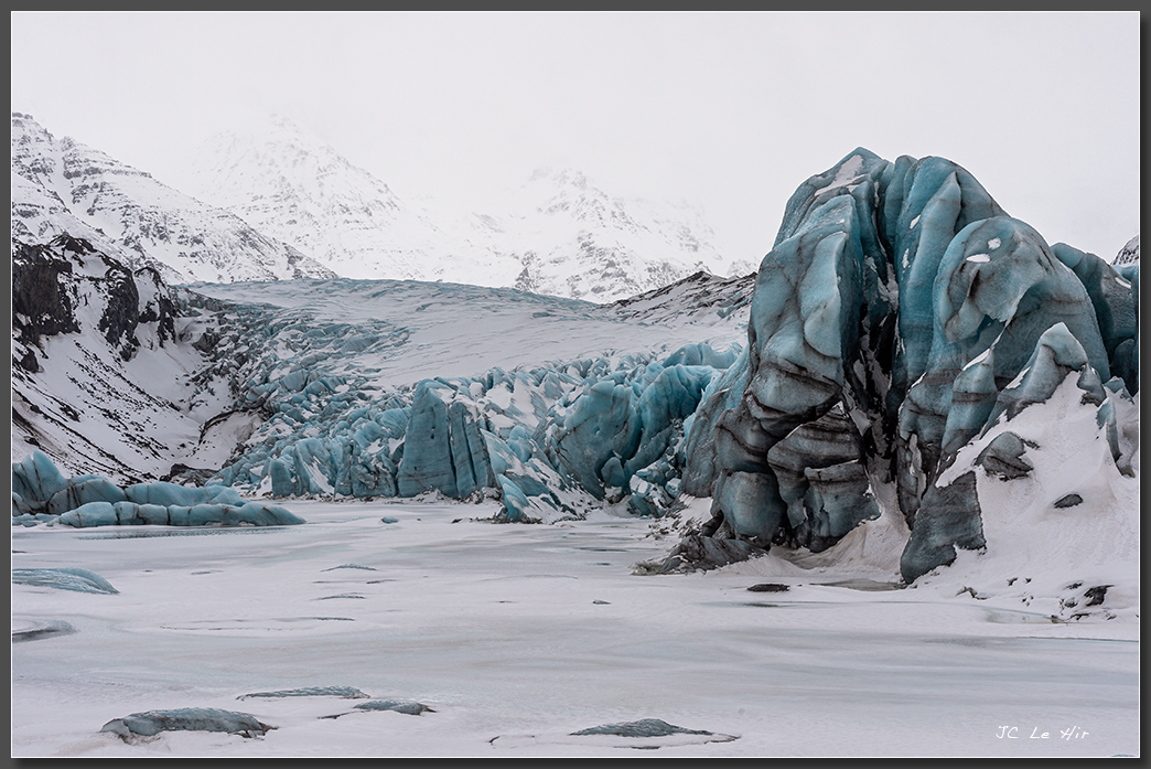 Mars 2022 : La glace compactée absorbe les radiations rouges, vertes et jaunes du spectre de la lumière et apparait du coup bleue dans cette langue glaciaire du grand glacier Vatnajoküll (Islande.