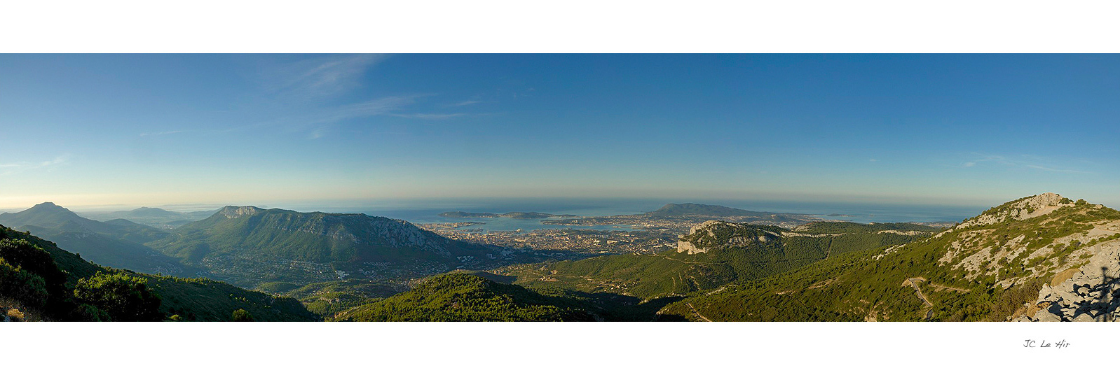 Du haut du mont Caume (800 m), le panorama permet d'embrasser les îles d'Hyères,le mont Faron, la rade de Toulon, le cap Sicié et l'archipel des Embiez. |