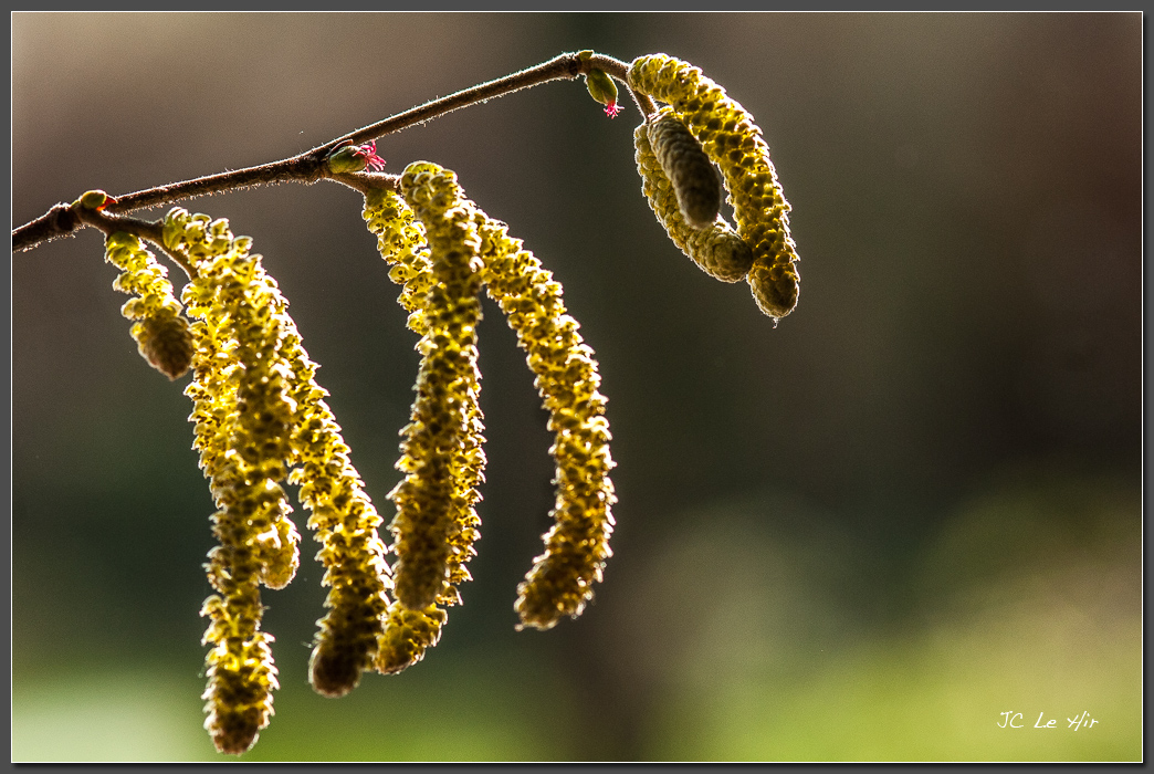 Les chatons sont en fait des grappes allongées de fleurs mâles, tandis que les bourgeons garnis d'un toupet rouge sont les chatons de fleurs femelles.