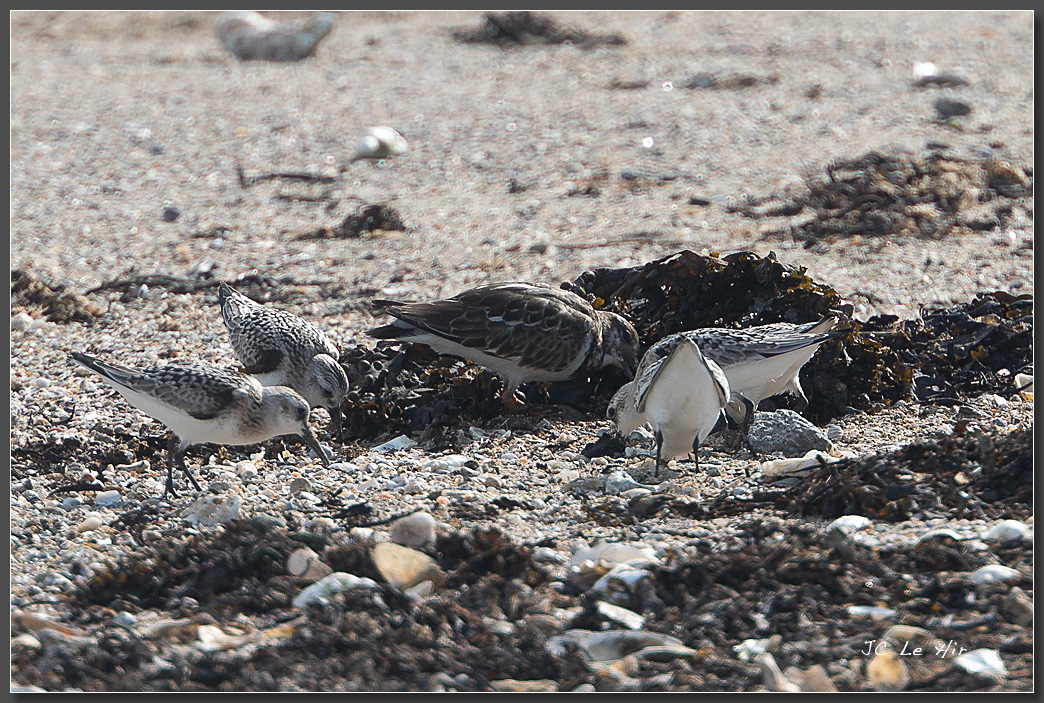 Bécasseaux sanderling (Calidris alba) et un Tournepierre à collier (Arenaria interpes) affairés à chercher des petits invertébrés marins dans les laisses de mer