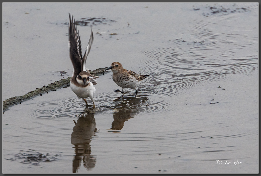 Conflit entre un Grand Gravelot (Charadrius hiaticula) qui se fait pourchasser par un Bécasseau Variable(Calidris alpina).