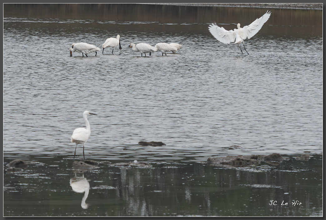 Sous le regard attentif de l'Aigrette garzette (Egretta garzetta), un groupe de Spatules blanches (Platlea leucorodia) parcourt le marais tout en balayant l'eau, bec légèrement entrouvert.