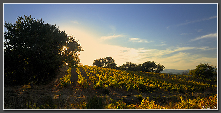 Fin d'après-midi, le soleil bas sur l'horizon fait chatoyer la palette des teintes chaudes du vignoble.