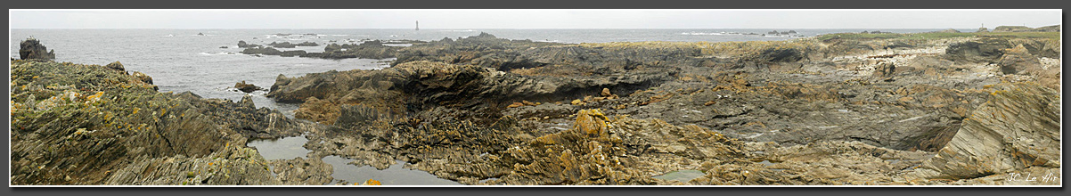 Penn ar Viler, pointe Sud-Ouest d'Ouessant. Les micaschistes ont remplacé les granites. Au loin, le phare de la Jument. |