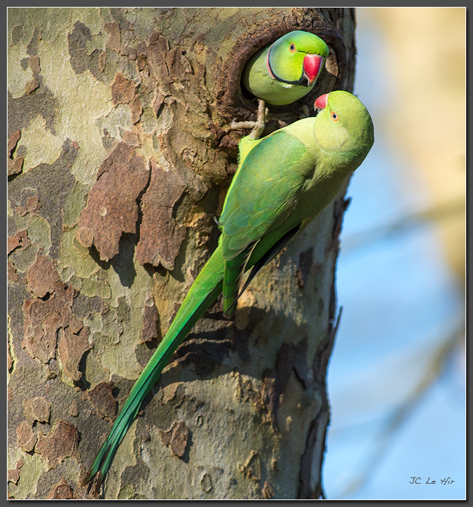 C'est l'heure de la relève au niveau du nid de ce couple de Perruches à collier (Psittacula krameri).