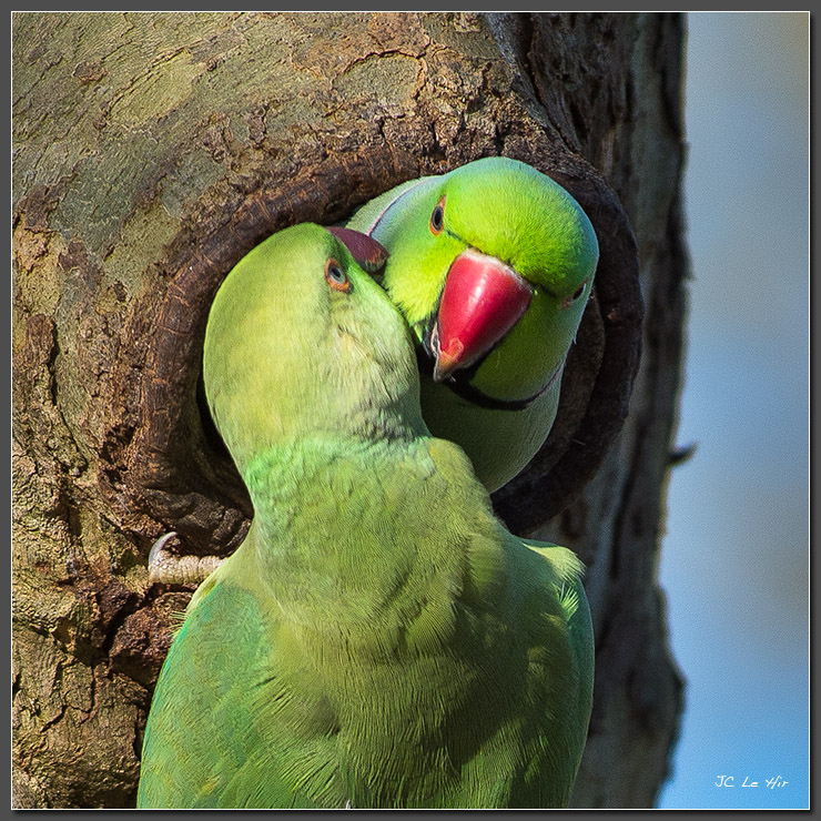 Gros plan sur le toilettage mutuel de tête auquel se livre ce couple de Perruches à collier à la sortie du nid.