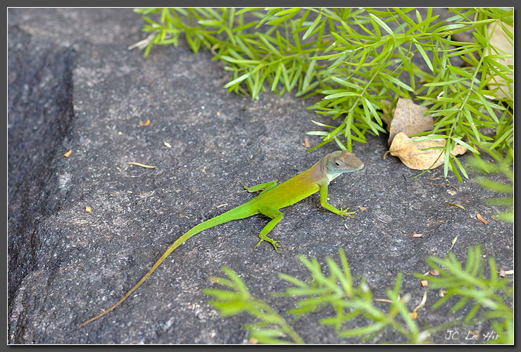 | L'Anolis (Anolis marmoratus) est un lézard très fréquent qui n'hésite pas à fréquenter les habitations pour y chasser les insectes . |