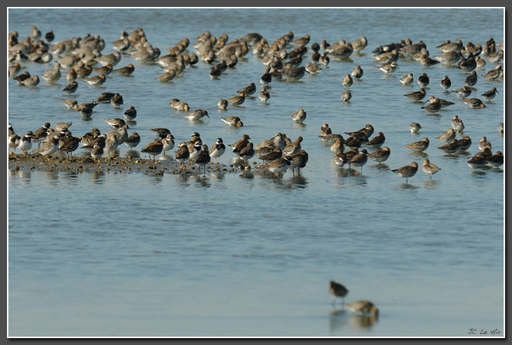 | La marée montante dans le Bassin d'Arcachon contraint les Limicoles (Grands Gravelots et Bécasseaux sur la photo) à revenir vers le delta de la Leyre et à se concentrer dans les lagunes. |