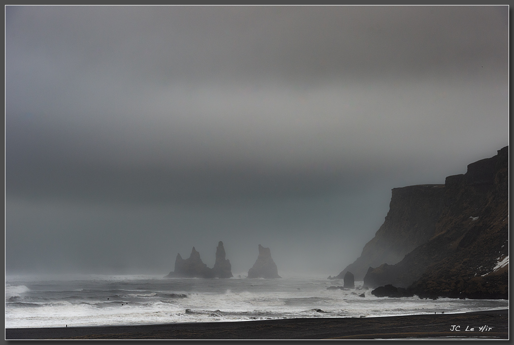Plage de Vik.Dans la brume générée par les embruns surgissent les aiguilles basaltiques.