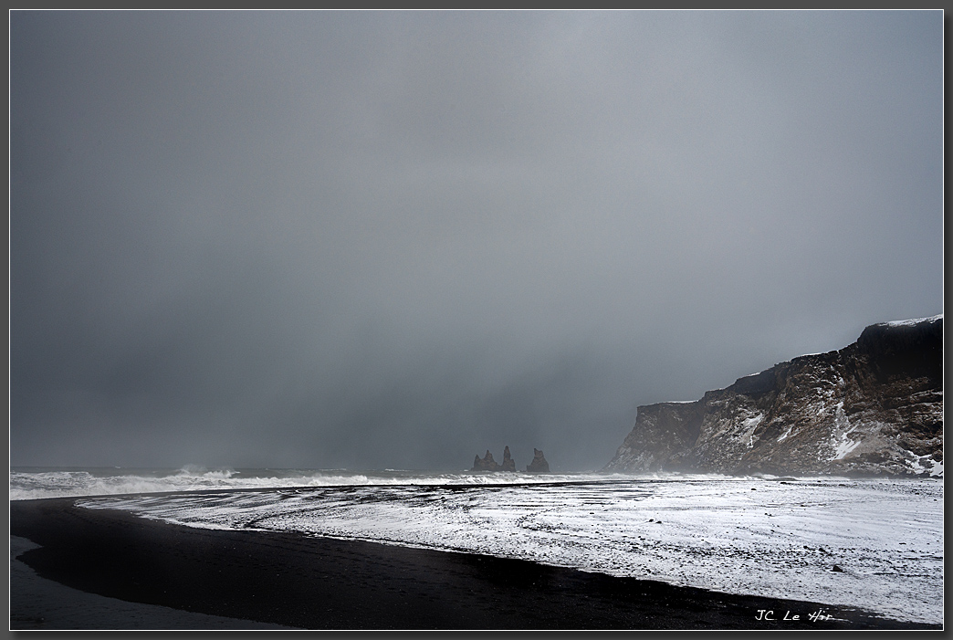 Plage de Vik. Dans le lointain les stacks (aiguilles) basaltiques de Reynisdrangar.