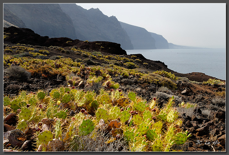 À la pointe nord-ouest de Tenerife Punta Teno, les vents forts ne permettent pas aux Figuiers de Barbarie (Opuntia dillenii-Cactaceae) de s'élever. Gare aux feuilles transformées en longues épines !