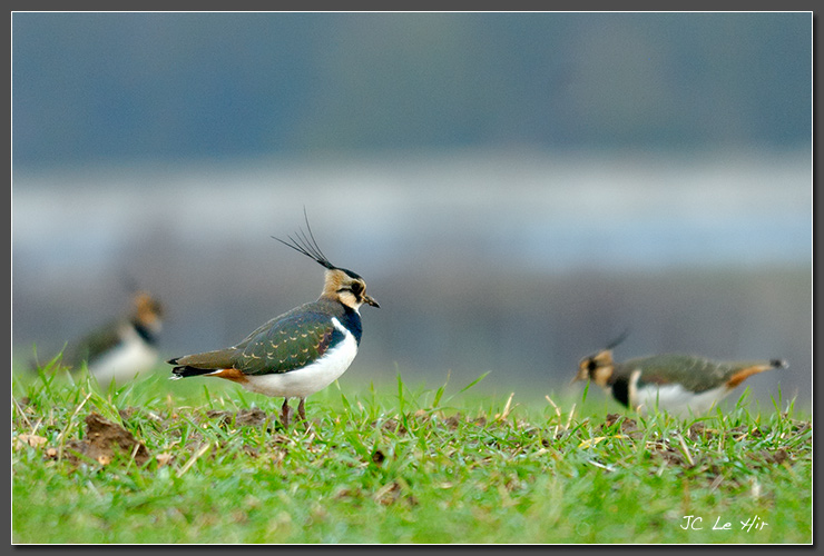 | Entre les jeunes pousses de blé dhiver, le Vanneau huppé (Vanellus vanellus) recherche sa pitance. Au menu , petits insectes, araignées, mille-pattes et également graines d'herbacées. |