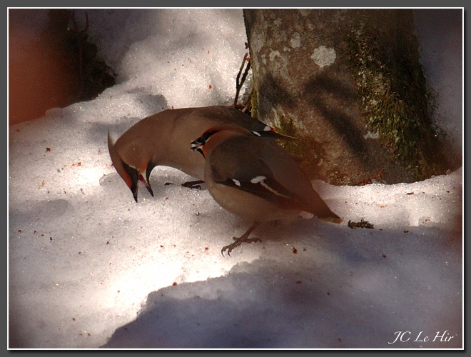 | La neige croquée à plein bec par ces Jaseurs boréaux (Bombycilla garrulus) (visiteurs exceptionnels de l'hiver 2005) leur fournit une ration d'eau indispensable à la digestion des baies desséchées qu'ils ont goulûment avalées. |