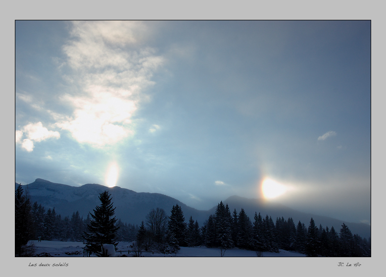 Ce matin là, deux soleils apparaissaient derrière la Petite Moucherolle et la Tête des Chaudières. Le vrai est à gauche et à droite le faux est une parhélie.