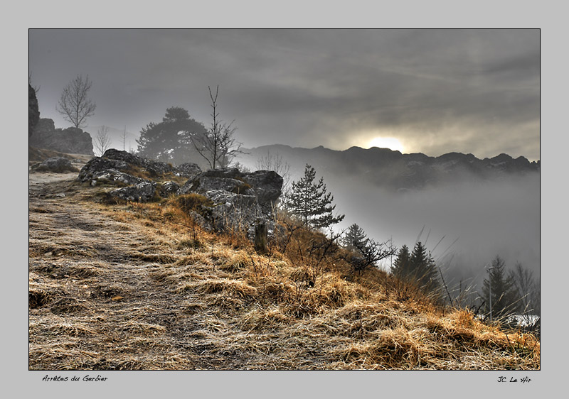 Au dessus des arrêtes du Gerbier, le soleil perce difficilement l'épaisse brume matinale.