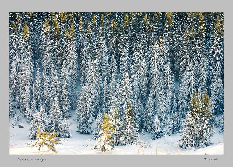 À l'ombre, au fond du vallon, la pessière maintient sa parure de neige.
