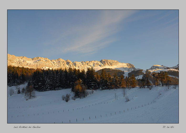 Fin d'après midi hivernale aux Clots, les arrêtes s'illuminent.