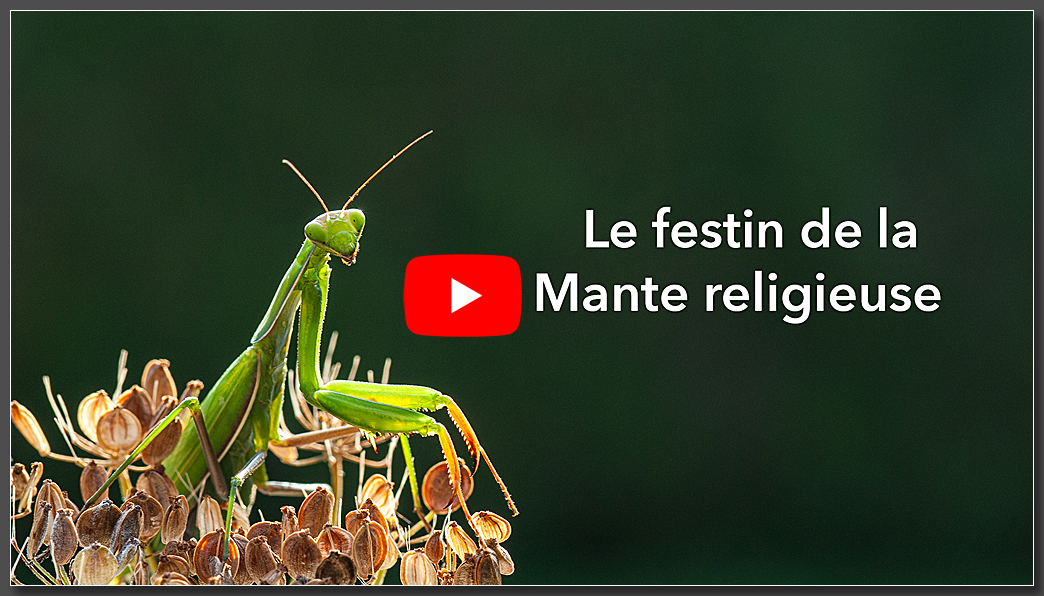 Dans la garrigue provençale, la Mante religieuse, redoutable chasseur, attend patiemment sa proie. Le criquet bleu Oedipoda caerulens capturé sera entièrement dévoré en moins de 15 minutes. La Mante fera ensuite une toilette méticuleuse.