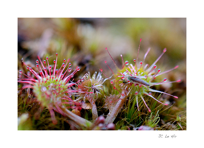 | Drame ordinaire dans la tourbière, l'insecte imprudent s'est posé sur le piège tendu par la discrète mais redoutable Drosère à feuilles rondes (Drosera rotundifolia - Droseraceae). Les poils visqueux garnissant les feuilles se replient sur l'insecte. Commence alors, au bénéfice de la plante carnivore, un lent processus de digestion. |