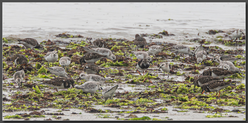 En se retirant à marée basse, la mer a abandonné sur le sable de nombreuses algues. De nombreux limicoles viennent y chercher pitance tels que ces Bécasseaux sanderling (Calidris alba) et Tournepierres à collier (Arenaria interpres).